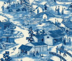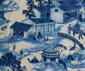One of our daring full width patterned designs showing a chinoiserie with fantastic hybrid creatures living amongst town folk in everyday life. Printed in two beautiful blue tones and a soft multi toned version.