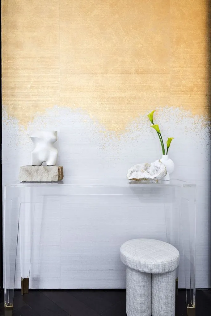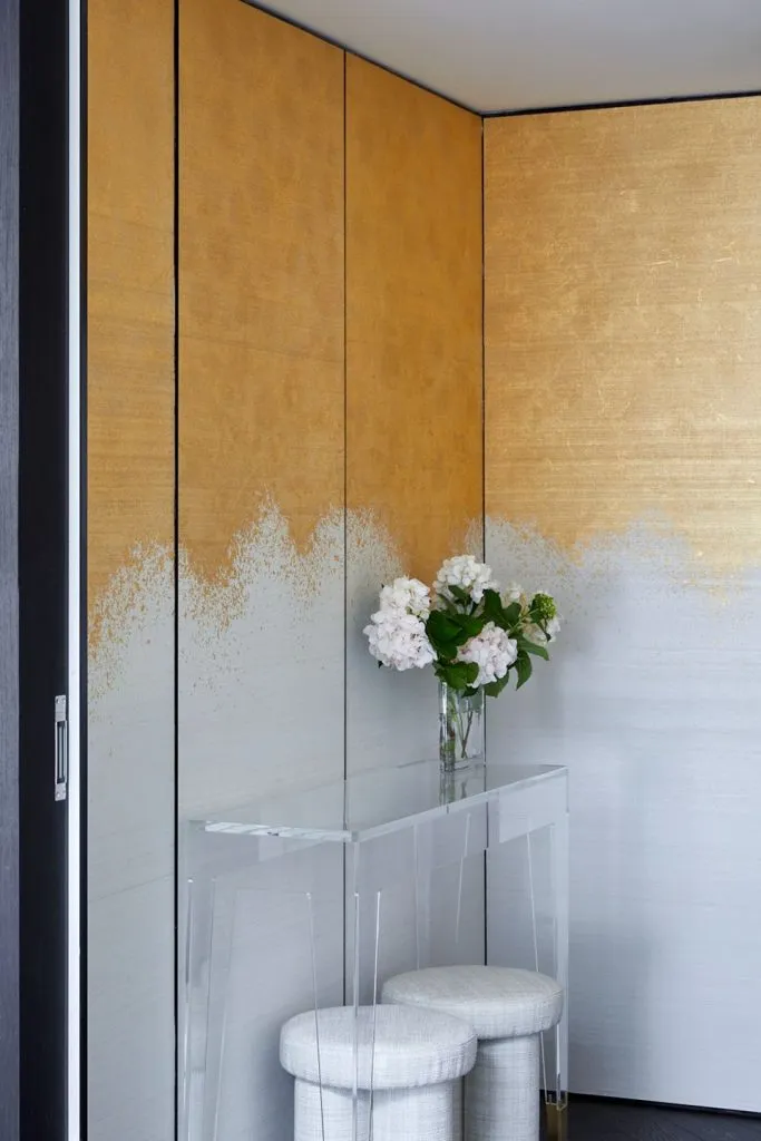 “We love a statement entrance and the foyer of Elizabeth Bay House is no exception. In the home of Design Principal Alexandra Kidd, the Phillip Jeffries radiant Metallic Ombre II Gold wallcovering creates a stunning first impression. The gold leaf waterfall cascades down the entrance wall panels, setting the perfect luxurious tone for the rest of the home.”