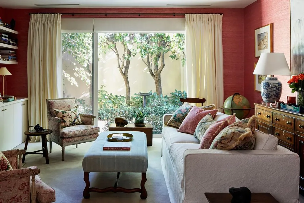 Throughout, we’ve seamlessly integrated cherished artworks and timeless antiques, revitalising each space with relaxed slipcovers and sumptuous upholstery in exquisite textiles. A delightful botanical wallpaper enlivens a petite powder room, while the snug, ensconced in coral pink raffia wallpaper, beckons as a cosy haven on chilly winter nights.