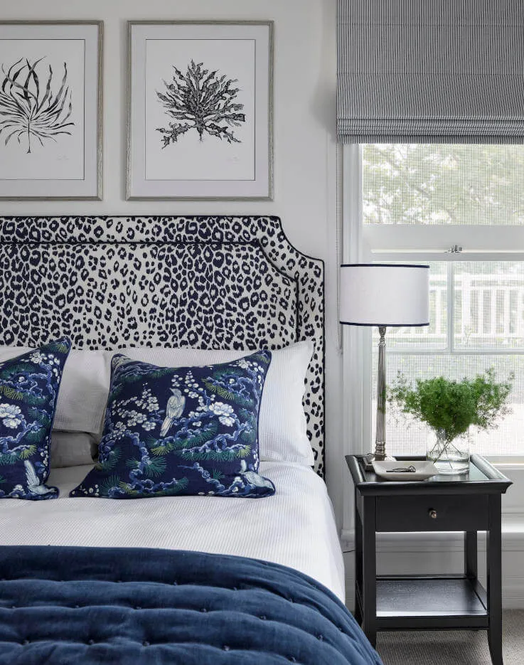 “Tasked with transforming a dilapidated property into a luxurious family home, we combined private spaces for sanctuary with areas to relax and recharge. The Textile Company’s Trend fabric 04235 – Navy from Vern Yip Vol. II Collection was the ideal choice for this fun yet sophisticated guest bedroom.”