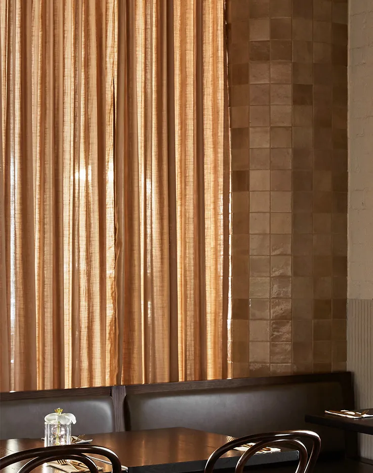 Interested in softening the industrial character of the warehouse building, Bergman & Co. introduced Camengo Fjord Chameau curtains from The Textile Company into the heart of the space. This linen-like voile subtly delineates the venue’s floristry and café spaces, lending privacy between settings. The softness of the fabric’s texture offers a subtle sense of movement, while its earthy tone harmonises with the blush veins of the nearby marble counters.“