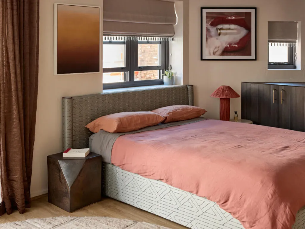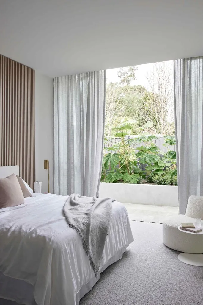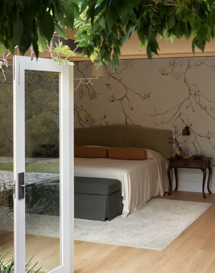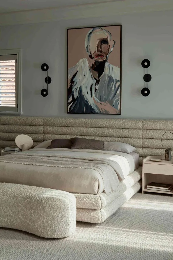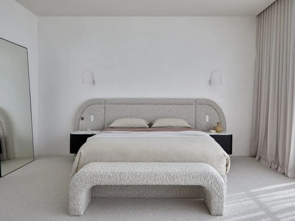 High Lawn House by Zenn Design elevates bedside living with its custom fully upholstered bedhead and Arch Bench Stool, both swathed in The Textile Com...